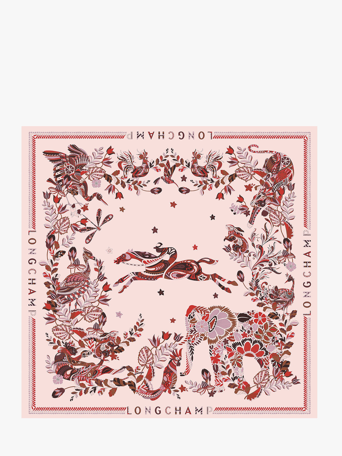 Ce grand carré de soie 90x90 cm, certifié GOTS, est un emblème de la Maison Longchamp. Illustré d’un tableau végétal où le cheval iconique s’entrelace avec des silhouettes animales, fleurs et plantes aux nuances douces et intemporelles, il incarne l’élégance naturelle et la créativité. Parfait pour sublimer vos tenues, ce foulard grand format raconte des histoires riches et complexes, prolongement artistique de la collection prêt-à-porter.