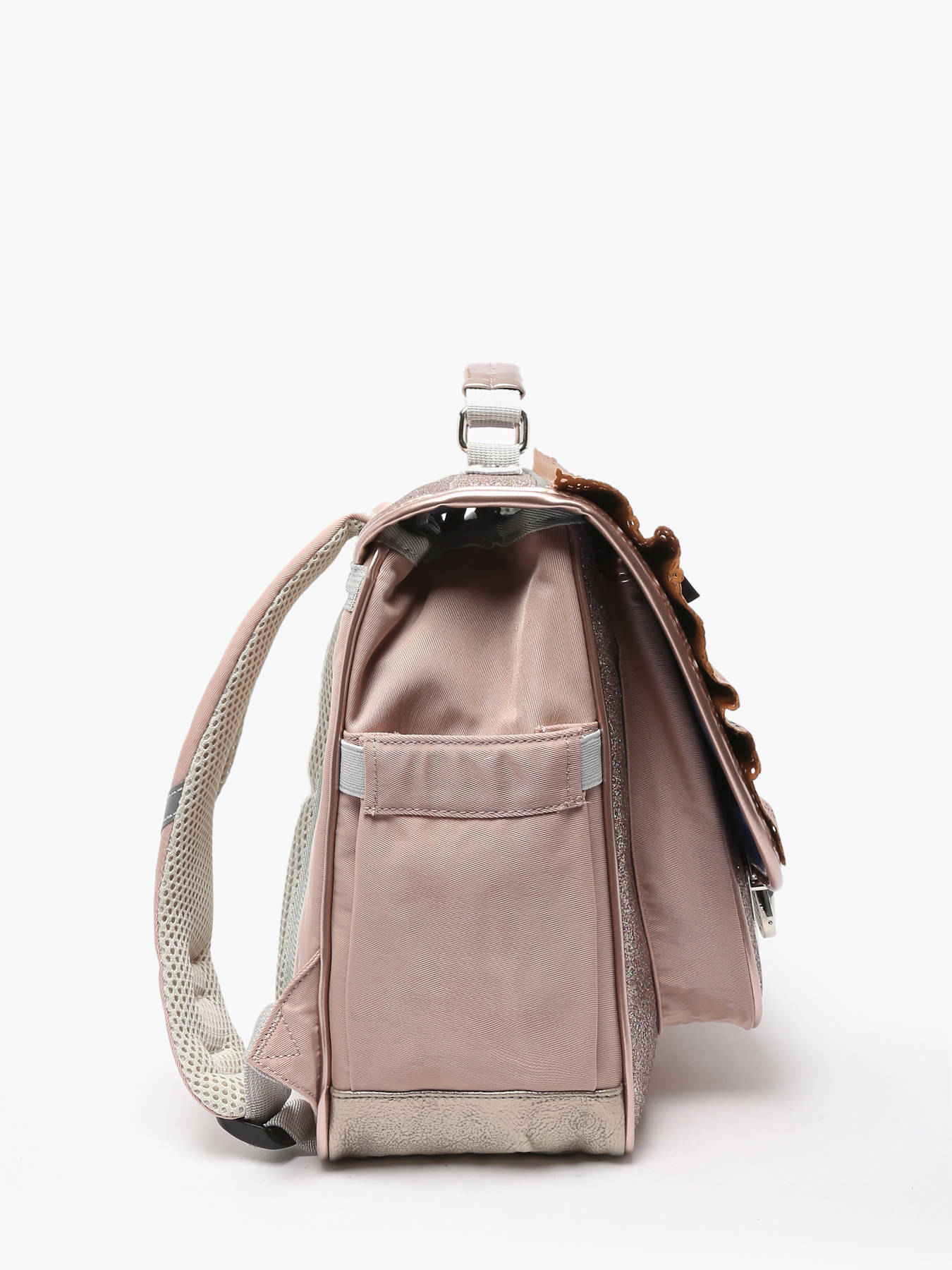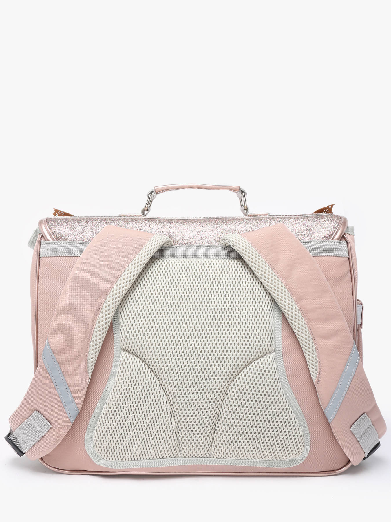 De boekentas heeft een mooie kleur (niet te rose) en tof ontwerp. Ze is stevig, zowel binnen- als buitenkant, en comfortabel om te dragen. Heel erg handig is het flesje aan de buitenkant. Dat geeft ruimte aan koekjes- en boterhamdozen in de tas zelf.